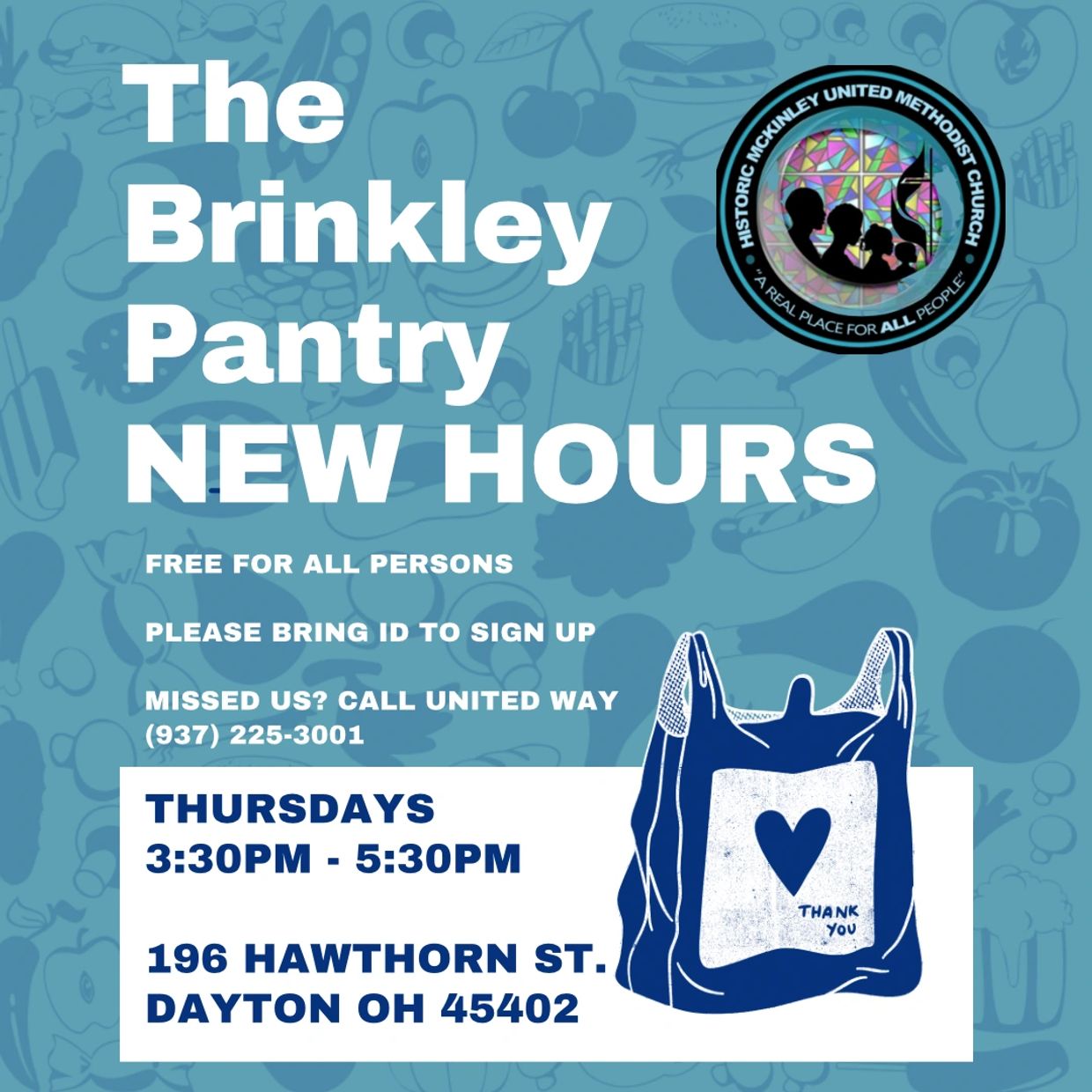 Need food? If you live in Dayton or Trotwood, you are welcome to come between 3:30pm and 5:30pm. The only thing you need to sign up is your ID. Each Thursday, except for holidays, we are open. In the event we are closed, call United Way 211
